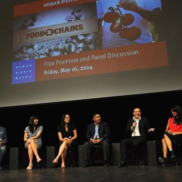 On May 16, 2014, 250 guests gathered at the Ann and Jerry Moss Theater at New Roads School for the screening of "Food Chains,” an award-winning documentary that explores critical human rights issues in American agriculture. Following the screening, Sanjay Rawal, the film’s director and producer, moderated a dynamic discussion with Lucas Benitez of the Coalition of Immokalee Workers, David Damian Figueroa of the Mexican American Legal Defense and Educational Fund, Grace Meng of HRW, and the film’s producer, Smriti Keshari . HRW is grateful to all of the guests, volunteers, and panelists for supporting the event. HRW would also especially like to thank the Neda Nobari Foundation for undewriting the event. Save the date for Sunday, September 21, 2014, when HRW will screen "Sweet Dreams." Stay tuned for more details!