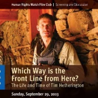 On September 29, 2013, 250 guests gathered at the Ann and Jerry Moss Theater at New Roads School for a screening of the powerful documentary about photojournalist and filmmaker Tim Hetherington, titled "Which Way is the Front Line from Here." Following the screening, Nick Goldberg, Editor of the LA Times Editoral Pages, moderated a moving discussion with Peter Bouckaert, HRW Emergencies Director, and Kelly McEvers, an NPR Correspondent who covered the wars in Iraq and Syria. HRW is grateful to all of the guests, volunteers, and panelists for supporting the event. HRW would also especially like to thank Catharine and Jeffrey Soros for sponsoring the event, and Laurel Glen Vineyard for donating wine. Save the date for Sunday, January 26, 2014, when HRW will screen "Bidder 70." Stay tuned for more details!