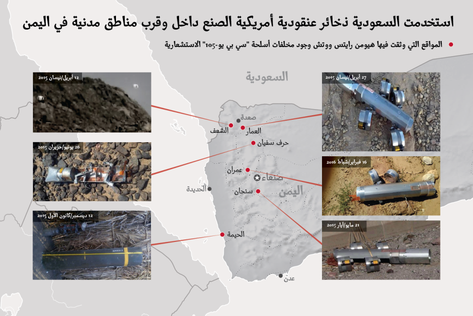 خلال العام الماضي وثقت هيومن رايتس ووتش الخسائر في صفوف المدنيين اليمنيين جراء استعمال التحالف بقيادة السعودية 4 أنواع من الذخائر العنقودية أمريكية الصنع أُطلقت عن طريق القصف الجوي والبري. منها القنابل "سي بي يو-105" بنظام استشعاري، في 6 غارات جوية على الأقل استهدفت محافظات عمران والحديدة وصعدة وصنعاء. سُجل أحدث هجوم بقنابل "سي بي يو-105" في 15 فبراير/شباط، في مصنع للإسمنت في محافظة عمران.