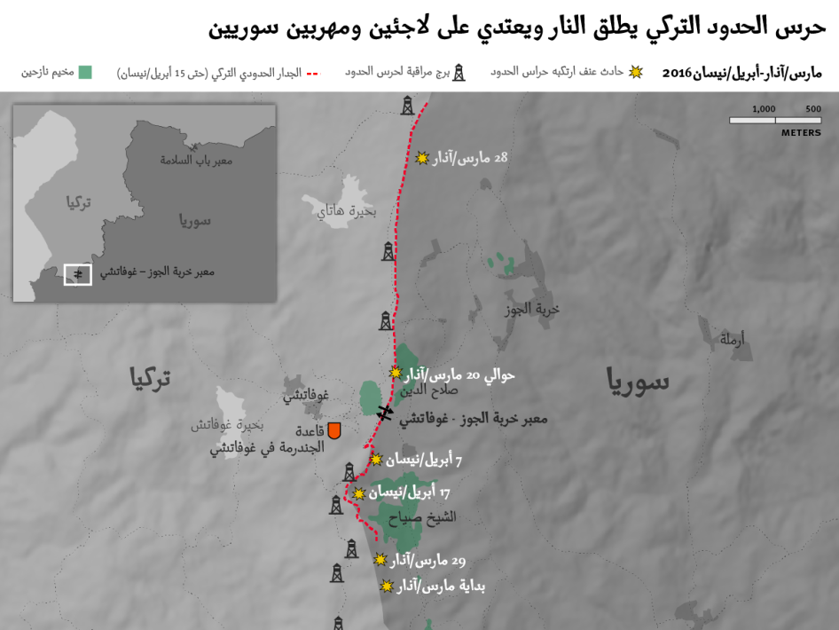 بحسب ضحايا وشهود وسكان سوريين محليين قابلتهم هيومن رايتس ووتش، استخدم حراس حدود أتراك في مارس/آذار وأبريل/نيسان العنف ضد طالبي لجوء ومهربين سوريين فقتلوا 5 أشخاص، منهم طفل، وأصابوا 14 آخرين إصابات خطيرة. تقول وزارة الخارجية التركية إنها تتبنى "سياسة الباب المفتوح" للسوريين، رغم أنها شيدت جدارا جديدا على الحدود.
