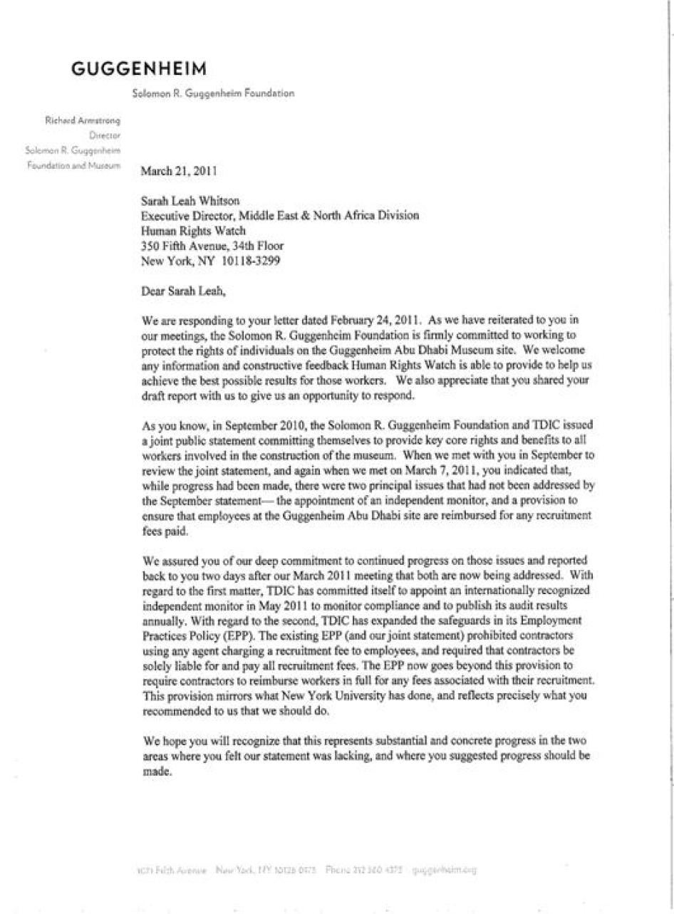 في سبتمبر/أيلول 2010 أصدرت مؤسسة سولومون ر. غوغنهايم وشركة التطوير والاستثمار السياحي – شركة التطوير المسؤولة عن مجمل أعمال البناء في جزيرة السعديات، بما في ذلك المتاحف والمنطقة الثقافية بالجزيرة – أصدرت بياناً مشتركاً وردت فيه ممارسات عمل شركة التطوير والاستثمار السياحي التي يبدأ سريانها من يوليو/تموز 2010، وتنص على بعض معايير العمل للعمال المستخدمين في أغلب مشاريع جزيرة السعديات، بما في ذلك فروع أبو ظبي لمتحفي غوغنهايم واللوفر. أقرت هيومن رايتس ووتش علناً بأهمية هذه الخطوات.