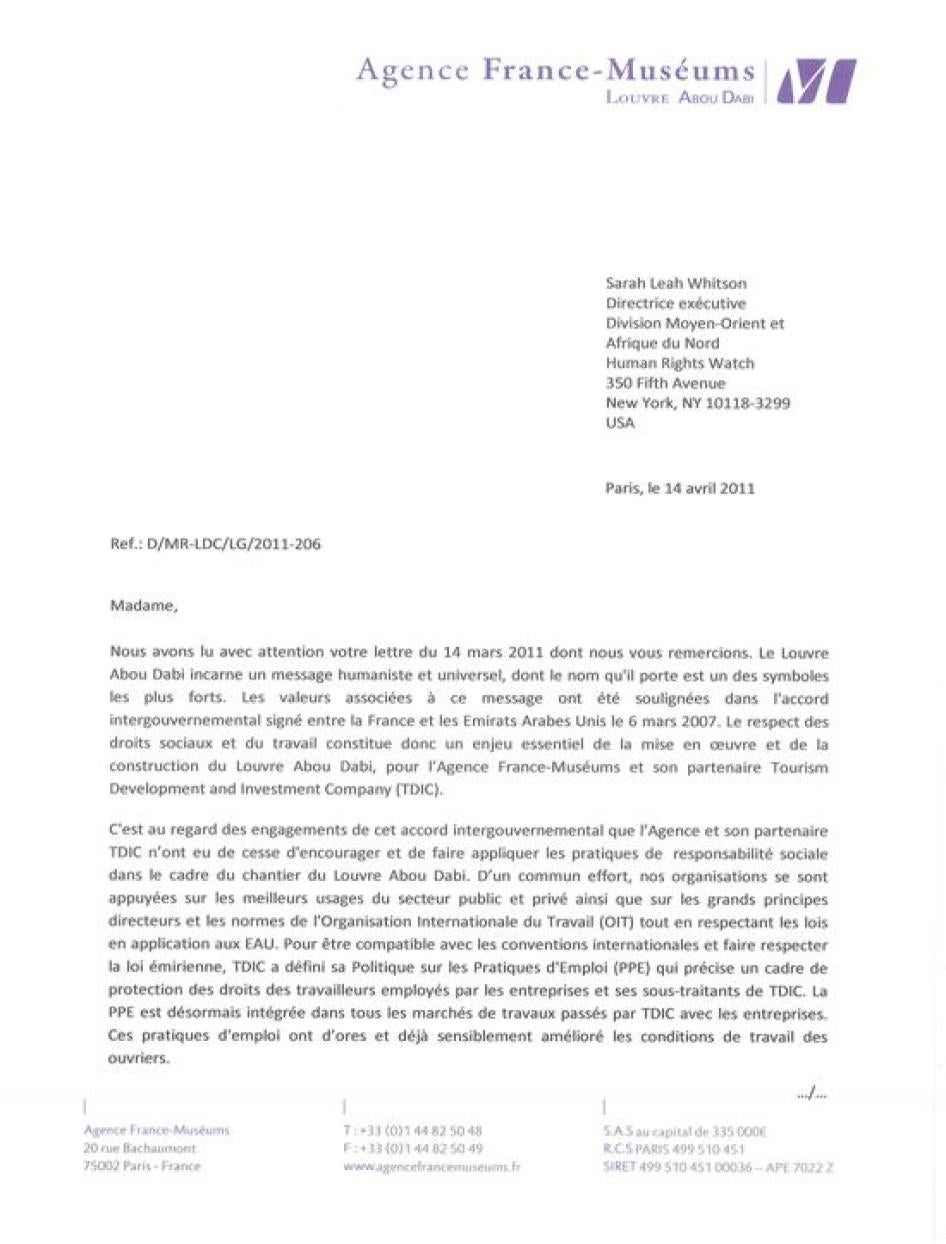 الرد المشترك الذي تلقيناه كتابةً من وكالة المتاحف الفرنسية ومتحف اللوفر على رسالتنا في فبراير/شباط 2011 وصف الأهمية التي يولونها لحقوق العمال، وأشاروا إلى: "داومنا على تشجيع وتطبيق ممارسات المسؤولية الاجتماعية في إطار العمل بموقع بناء اللوفر-أبو ظبي" وشددوا على التزامهم القوي بـ "المعايير الاجتماعية العالية، ليس فقط في موقع البناء، بل أيضاً في كل أجزاء مشروع اللوفر-أبو ظبي". إلا أن الرسالة لم تتناول بواعث القلق الخاصة بالانتهاكات على الجزيرة. ورغم التعبير عن التزامات قوية بضمان احترام حقوق العمال، فإن وكالة المتاحف الفرنسية استمرت في الخصم من مسؤوليات المتحف إزاء العمال: "الطرف الفرنسي ليست عليه أية مسؤولية في بناء المتحف، بما أن الطرف المُكلف بهذا الأمر بموجب الاتفاق هو شركة التطوير والاستثمار السياحي".[9]