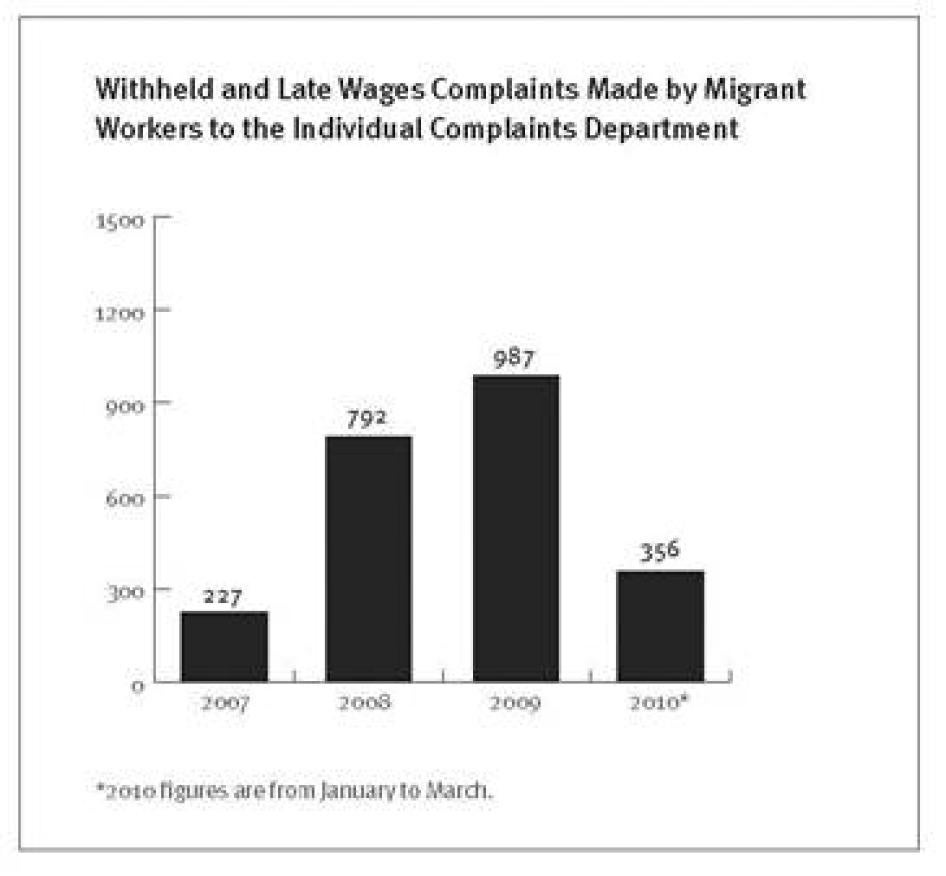 عندما يصل الوافدون إلى البحرين، فإنهم يعتمدون على انتظام تلقي أجورهم لتلبية حاجتهم الماليّة الملحة وحاجات أسرهم أو لإعادة تسديد القروض على دفعات شهريّة. وأشار العمّال إلى أنّ مشكلة تأخير أجورهم يتصدر لائحة شكاويهم. وعلى الرغم من أن عدم سداد الأجور يُشكِّل جريمة جنائيّة ومدنيّة في البحرين، إلاّ أنّ بعض أصحاب العمل يحرمون العمّال الوافدين أجورهم لمدّة أشهر. وحيث يفتقر العمّال الوافدون إلى مصدرٍ للدخل تراهم يتورطّون في المزيد من الديون لتغطية الحاجات الأساسيّة. خلال العامين 2008 و2009، تلقى قسم التحكيم وشكاوى العمال في وزارة العمل حوالي 1800 شكوى بشأن التأخر في سداد الأجور. ومن بين العمّال الوافدين الذين قابلتهم هيومن رايتس ووتش، وعددهم 62، أفاد 32 بأنّ أصحاب العمل حجزوا على أجورهم لفترةٍ تتراوح بين ثلاثة وعشرة أشهر ولم تتقاضى إحدى عاملات المنازل  أجرها من صاحب العمل لمدّة خمس سنوات. لم ترد الحكومة على طلب إحاطة بالأعداد في عامي 2010 و2011 أرسلته هيومن رايتس ووتش للحكومة البحرينية في 2012.
