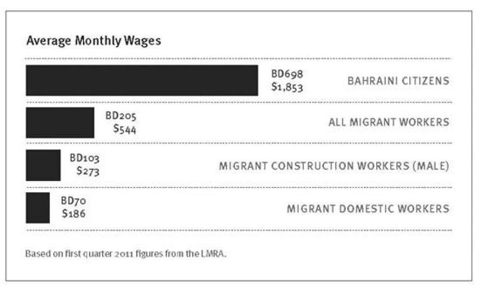 في المتوسط، يجني العامل الوافد في البحرين مبلغ 205 دينار أي ما يُعادل 544 دولاراً في الشهر بالمقارنة مع 698  ديناراً (1853 دولاراً) يجنيها المواطن البحريني ويُشكِّل العمّال الوافدون نسبة 98% من العمّال الذين يتقاضون أجوراً متدنيّة (وتُعرِّف الحكومة "الأجر المتدني" بالأجر الذي يقلّ عن 200 دينار أو 530 دولاراً في الشهر). ويتقاضى معظم العمّال الوافدين الذين قابلتهم هيومن رايتس ووتش بين 40 و100 دينار بحريني (ما يُعادل $106-$265) في الشهر، مقابل قلة يجنون حتّى 120 ديناراً (318 دولاراً) مع بدل الوقت الإضافي. وتفرض الحكومة الهنديّة أجراً شهريّاً بقيمة 100 دينار (265 دولاراً) كحدٍ أدنى لمواطنيها العاملين في البحرين في حين تفرض الحكومة الفيليبينيّة مبلغ 150 دينار (398 دولاراً) كحدٍ أدنى. ونادراً ما يُسدد أصحاب العمل هذه الأجور، كما قاومت الحكومة البحرينية مساعي اعتماد تشريع الحدّ الأدنى للأجور.