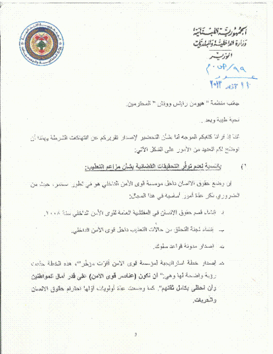 [62] كتاب وزير العدل شكيب قرطباوي إلى النائب العام، 11 أغسطس/آب 2012. على: http://www.legal-agenda.com/images/legalnews/1346419736- كتاب %20 وزير %20 العدل %20 شكيب %20 قرطباوي .pdf  (تمت الزيارة في 7 فبراير/شباط 2013).