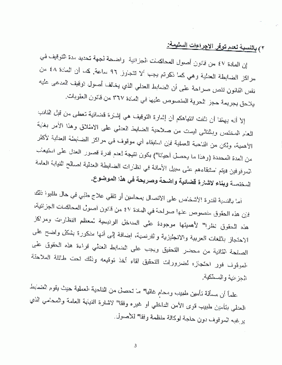 • يجب ضمان تنفيذ قوى الأمن الداخلي على النحو الملائم لقانون أصول المحاكمات الجزائية، لا سيما الحدود التي يفرضها القانون على الاحتجاز على ذمة التحقيق ومطلب إحالة المحتجزين على وجه السرعة للعرض على قضاة التحقيق.