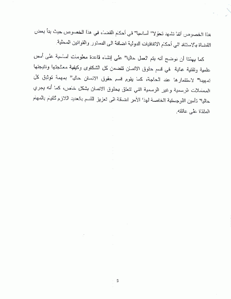 • يجب تبني قانون يصرح بتشكيل آلية وطنية وقائية لمراقبة مراكز الاحتجاز ولمكافحة التعذيب، كما يتطلب البروتوكول الاختياري لاتفاقية مناهضة التعذيب.