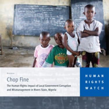 Der 107-seitige Bericht „Chop Fine: The Human Rights Impact of Local Government Corruption and Mismanagement in Rivers State, Nigeria” dokumentiert den Missbrauch von öffentlichen Gerldern durch Beamte im geographischen Zentrum von Nigerias florierender Erdölindustrie und die schädlichen Auswirkungen auf das Schul- und Gesundheitswesen. Der Bericht basiert auf Umfragen im Staat Rivers mit Vertretern der Regierung, Repräsentanten von Spendeninstitutionen, Staatsbeamten, Angestellten des Gesundheitswesens, Lehrern, Vertretern der Zivilgesellschaft und Bewohnern vor Ort. Zusätzlich untersuchte Human Rights Watch die Budgets der Regierung auf staatlicher und lokaler Ebene.