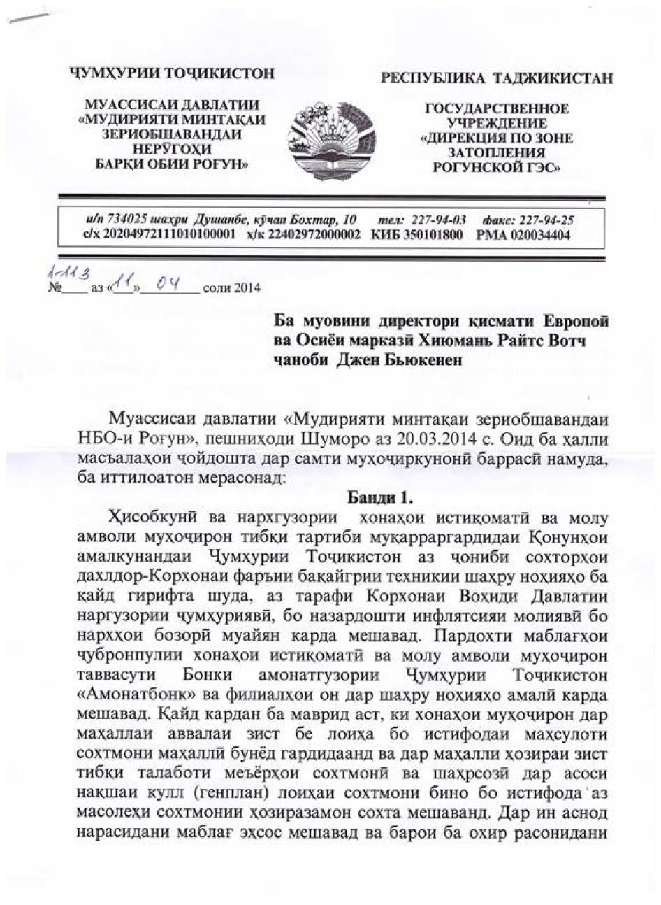[253] Мактуб аз Марша Олив, менеҷери кишварии идораи Бонки ҷаҳонӣ дар Тоҷикистон ба Созмони Дидбони ҳуқуқи башар, 30 апрели соли 2014.