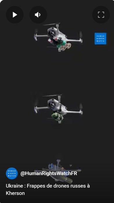 Les chercheurs de Human Rights Watch ont mené des entretiens avec 36 survivants et témoins des attaques par les drones russes à Kherson, et analysé 83 vidéos d’attaques de drones mises en ligne, souvent avec des légendes, sur des chaînes Telegram affiliées à l’armée russe, ainsi que des vidéos et des photographies que des témoins ont prises et transmises aux chercheurs. Grâce à ces vidéos, Human Rights Watch a pu confirmer que les forces russes utilisaient des drones quadricoptères disponibles sur le marché, fournis par deux sociétés fabriquant des drones basées en Chine, DJI et Autel, ainsi qu’un modèle produit par une entité russe, Sudoplatov, qui se décrit comme une organisation de bénévolat « groupe de volontaires ».