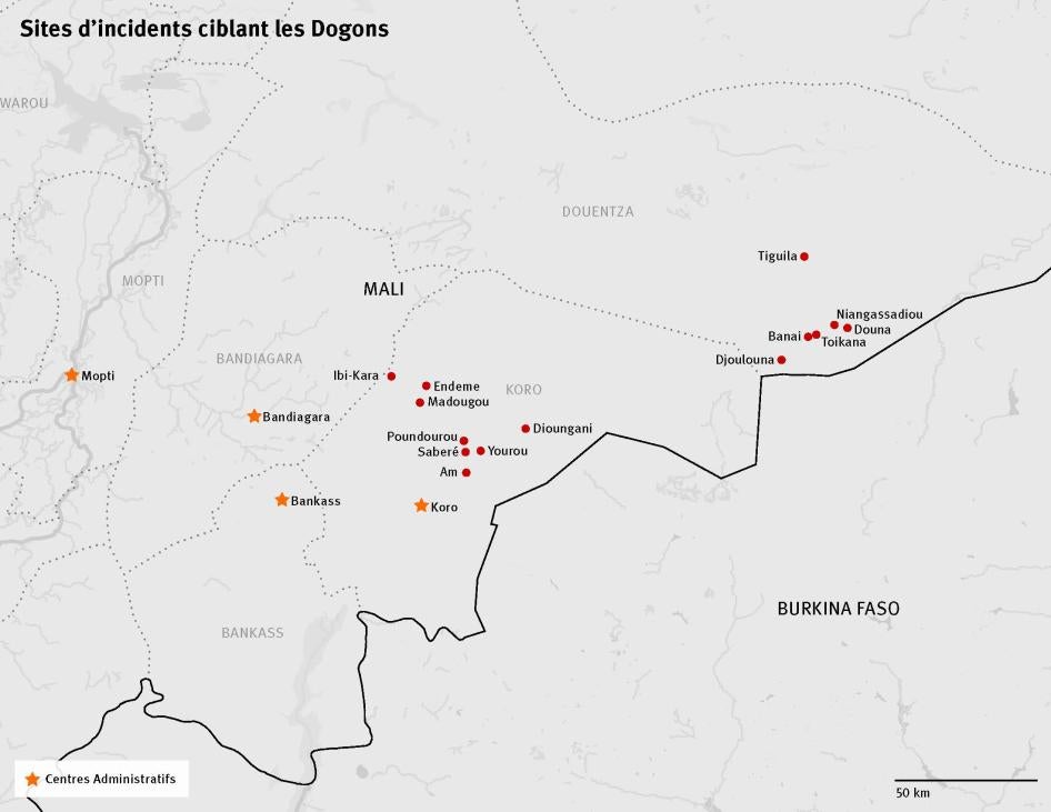 Le présent rapport, qui s’appuie sur trois missions d’enquête menées en février, en mai et en juillet 2018, et sur des entretiens téléphoniques en 2018, documente les massacres, les attaques de villages et les meurtres de représailles de civils peuls, bambaras et dogons dans le centre du Mali en 2018, notamment des abus commis dans 42 villages et hameaux de la région de Mopti, particulièrement à proximité de la frontière avec le Burkina Faso et près de la ville de Djenné, inscrite sur la Liste du patrimoine mondial de l’Organisation des Nations unies pour l'éducation, la science et la culture (UNESCO). Nous nous sommes entretenus avec des personnes qui ont été victimes ou témoins des meurtres et d’autres violations ; des leaders des groupes d’autodéfense ; des leaders communautaires peuls, dogons et bambaras ; des fonctionnaires gouvernementaux ; des diplomates ; des travailleurs humanitaires et des analystes de la sécurité. Au total, nous avons mené des entretiens avec148 personnes en 2018. Nous avons également utilisé un grand nombre d’entretiens conduits au Mali entre 2015 et 2017 pour définir les origines et le contexte des violations commises en 2018.