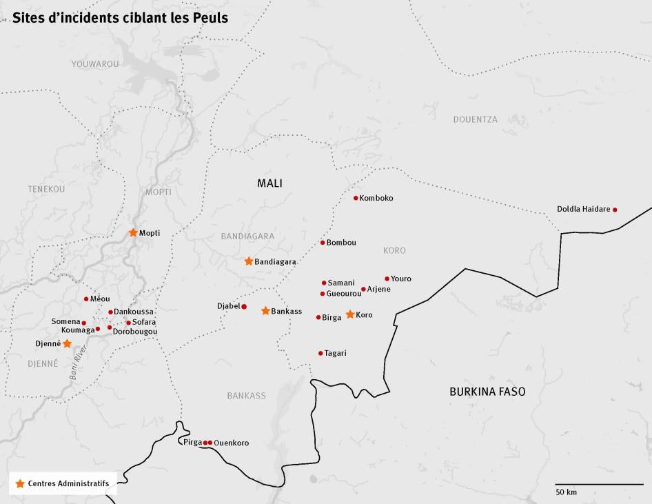 Le rapport rend compte de 26 attaques contre des villages peuls qui auraient été commises par des groupes d’autodéfenses bambaras et dogons lors desquelles au moins 156 civils peuls ont été tués. Ces attaques ont visé 10 villages : Koumaga, Dankoussa, Meou, Bombou, Someni, Dolda Haidara, Gueourou, Komboko, Pirga et dans les environs de Sofara, tuant toujours entre huit et 23 villageois. Un grand nombre des atrocités commises par des milices semblent être pour venger des meurtres de membres des communautés Dogon ou Bambara qui seraient le fait de groupes islamistes armés. Les groupes d’autodéfense ont fréquemment répondu en menant des attaques représailles contre des hameaux ou des villages entiers. Environ 50 villageois peuls, dont des enfants, qui étaient détenus par les milices ou qui ont fui les attaques, restent portés disparus au moment de la rédaction du présent rapport.