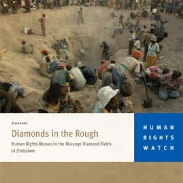 (ירושלים) - ארגון Human Rights Watch אמר היום כי אסור שמנגנון התיעוד של תהליך קימברלי יאפשר את המשך היצוא משדות היהלומים של מרנגה בזימבבואה עד אשר תשגנה הממשלות התקדמות ברורה בסוגיית הפסקתן של ההברחות והפרות זכויות האדם. מנגנון התיעוד הוא גוף בינלאומי המפקח על הסחר ביהלומים, והגורמים המשתתפים בו צפויים להיוועד בירושלים בין ה-1 ל-4 בנובמבר 2010.