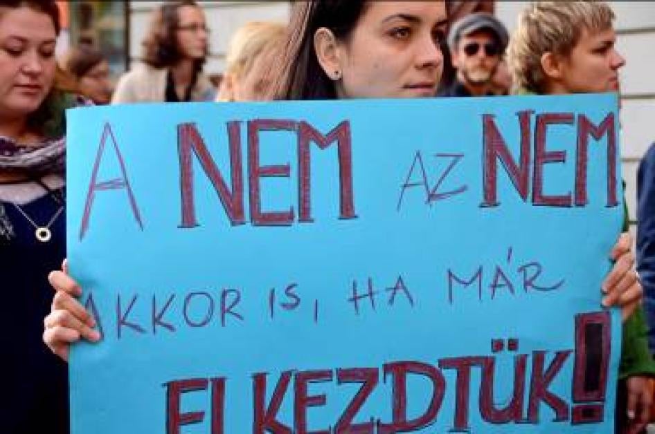 “A NEM az NEM, akkor is, ha már elkezdtük” – Tüntetés Budapesten a szexuális és családon belüli erőszak ellen. 2013. szeptember 13. © 2013 Human Rights Watch