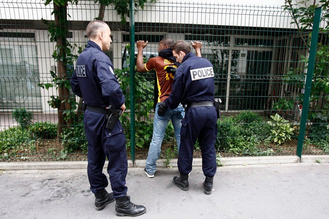 Police officers perform an identity check and body pat-down of a young man in Paris, France on June 6, 2011.