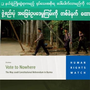 The 61-page report, “Vote to Nowhere: The May 2008 Constitutional Referendum in Burma,” shows that the referendum is being carried out in an environment of severe restrictions on access to information, repressive media restrictions, an almost total ban on freedom of expression, assembly, and association, and the continuing widespread detention of political activists. It highlights recent government arrests, harassment and attacks on activists opposed to the draft constitution.