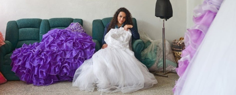 Kinda felt scared as they walked into the market, all four women wearing the hijab (headscarf) and abaya (long, loose-fitting robe). But when they took these off to reveal white bridal dresses underneath, Kinda said, she felt happy and strong, like no one could stop them. They walked slowly through the market, holding up signs with messages such as, “We declare an end to military action in Syria,” and “You are tired, we are tired, we need another solution.” They called themselves the “Brides of Peace.”