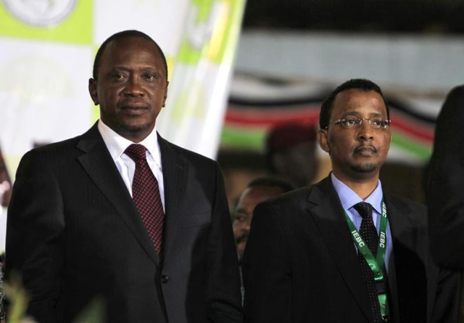 President elect Uhuru Kenyatta (L) and the Independent Electoral and Boundaries Commission (IEBC) Chairman Issack Hassan stand for the national anthem in Nairobi on March 9, 2013. © 2013 Reuters