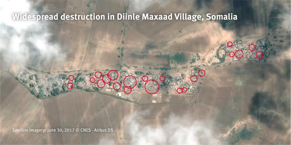 Human Rights Watch analyzed satellite imagery showing changes over time recorded between May 8 and July 12, 2017, and found evidence of widespread building destruction in 18 of 32 villages assessed in Merka district. Damage in all cases was consistent with arson attacks that resulted in the probable destruction of several hundred residential and community buildings. Because of partial cloud cover in available satellite imagery, it was not possible to assess the change in many locations in the area and it is possible that the total number of affected villages from the recent attacks is larger than the 18 locations currently identified.