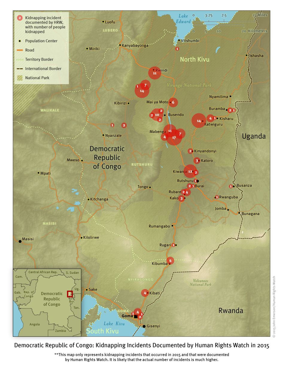 A Human Rights Watch confirmou o seqüestro em troca de resgate de 172 congoleses e três cidadãos estrangeiros em 35 incidentes em Rutshuru, dois em Nyirangongo, um em Walikale, e quatro em Goma, em 2015. O número real de casos é provavelmente muito maior. A Human Rights Watch também recebeu relatos de casos de seqüestro na cidade de Butembo e no território Beni em 2015, mas eles vão além do escopo desta pesquisa.