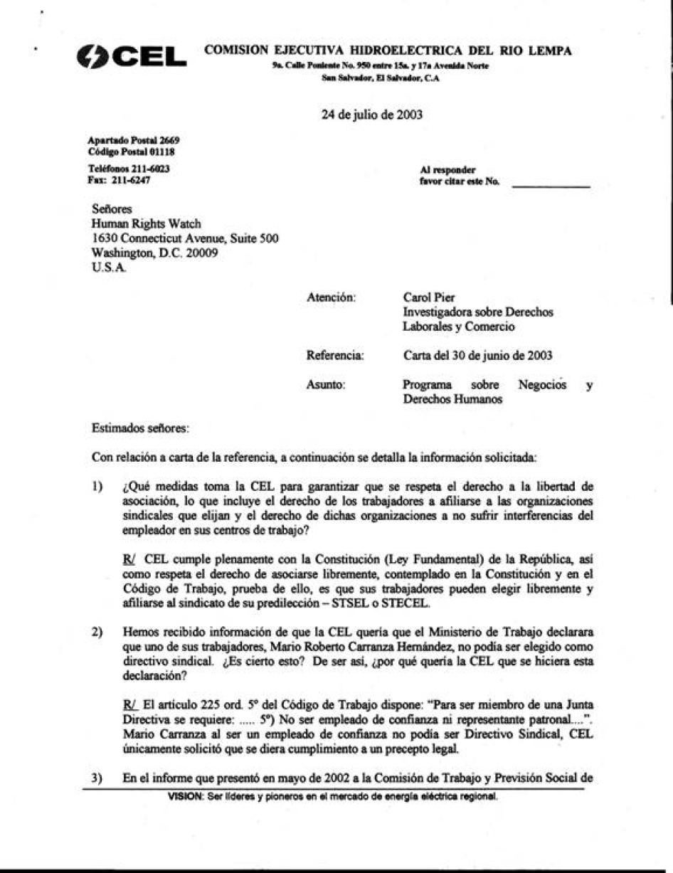 [395] Human Rights Watch interview, Ernesto Gmez, labor lawyer, San Salvador, February 15, 2003.