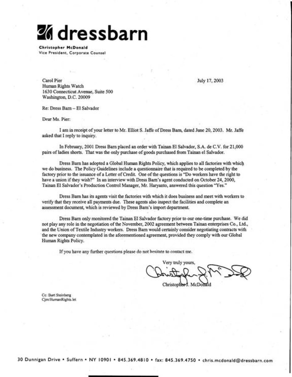 [434] Letter from Christopher J. McDonald, vice president and corporate counsel, Dress Barn, Inc., to Human Rights Watch, July 17, 2003.