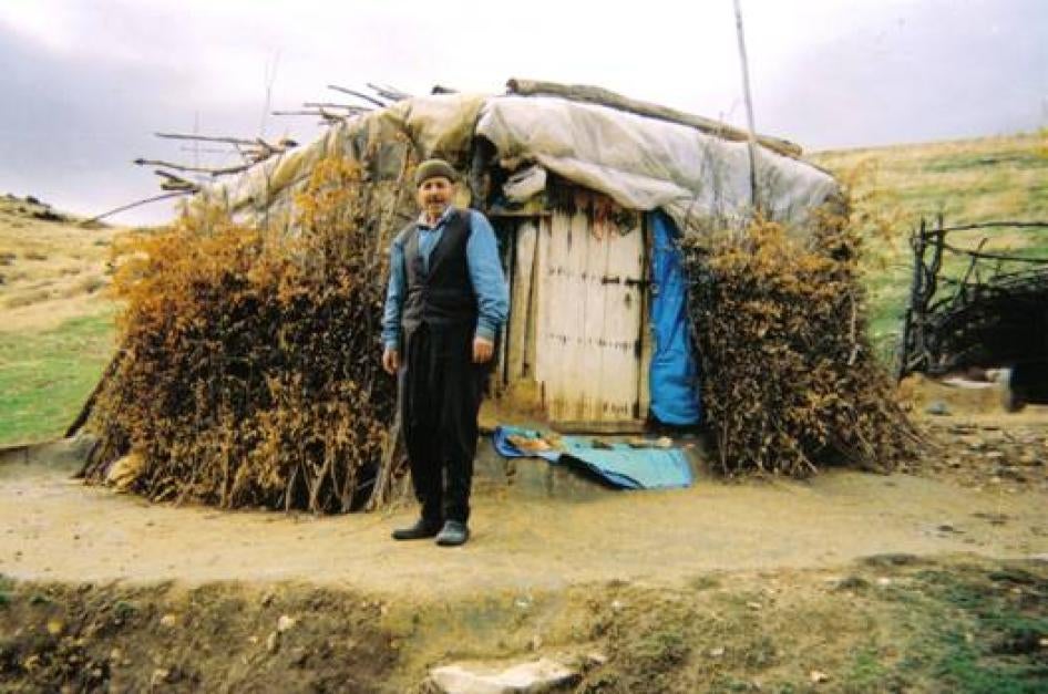 Recently returned villager in front of a makeshift shelter. Security forces destroyed his home and the rest of the village in Diyarbakir province in 1992. (c) 2004 Jonathan Sugden/Human Rights Watch