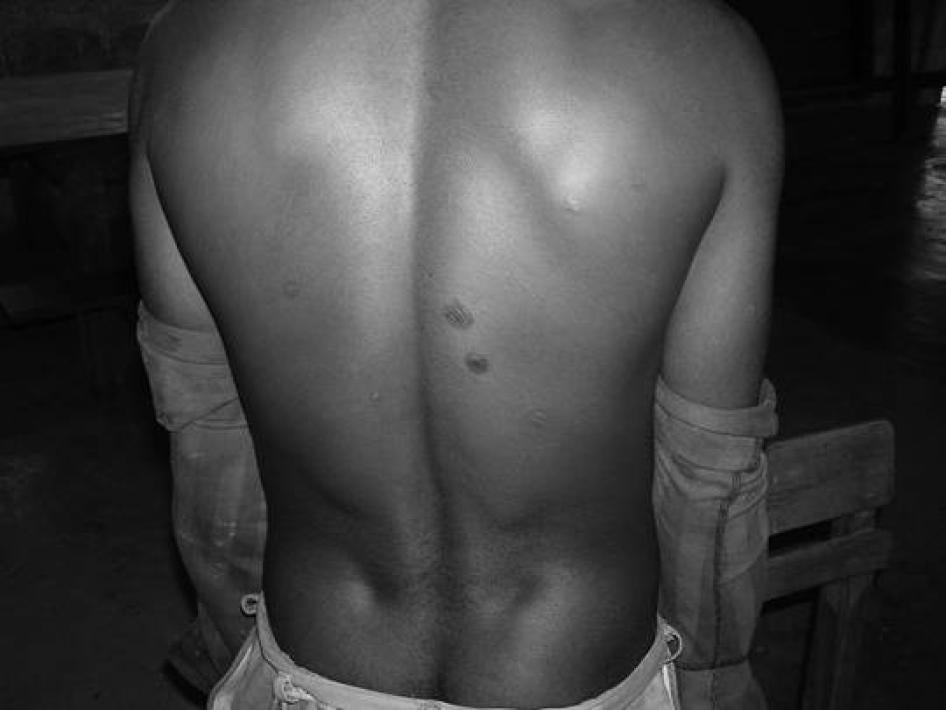 Steven E. showed us two thin scars, each around one inch long, that he said were from being cut with scissors.[2] "Then the police officer came with a smoke fire [large stick of tobacco] and burned me. I was wearing a shirt and they took it off," he told us. He also showed us two round scars on each side of his back that he said were from where the police burned him. A pediatrician who viewed photographs of the scars told us that the fact that the scars were round, were located on both sides of the back, and were well-circumscribed and demarcated "makes it much more suspicious that they were deliberately inflicted and not an accident." While she said she could not say for certain that they were from burns, she noted that "the increased pigmentation and that the scars are flush with the skin" were consistent with a healed burn.[3]