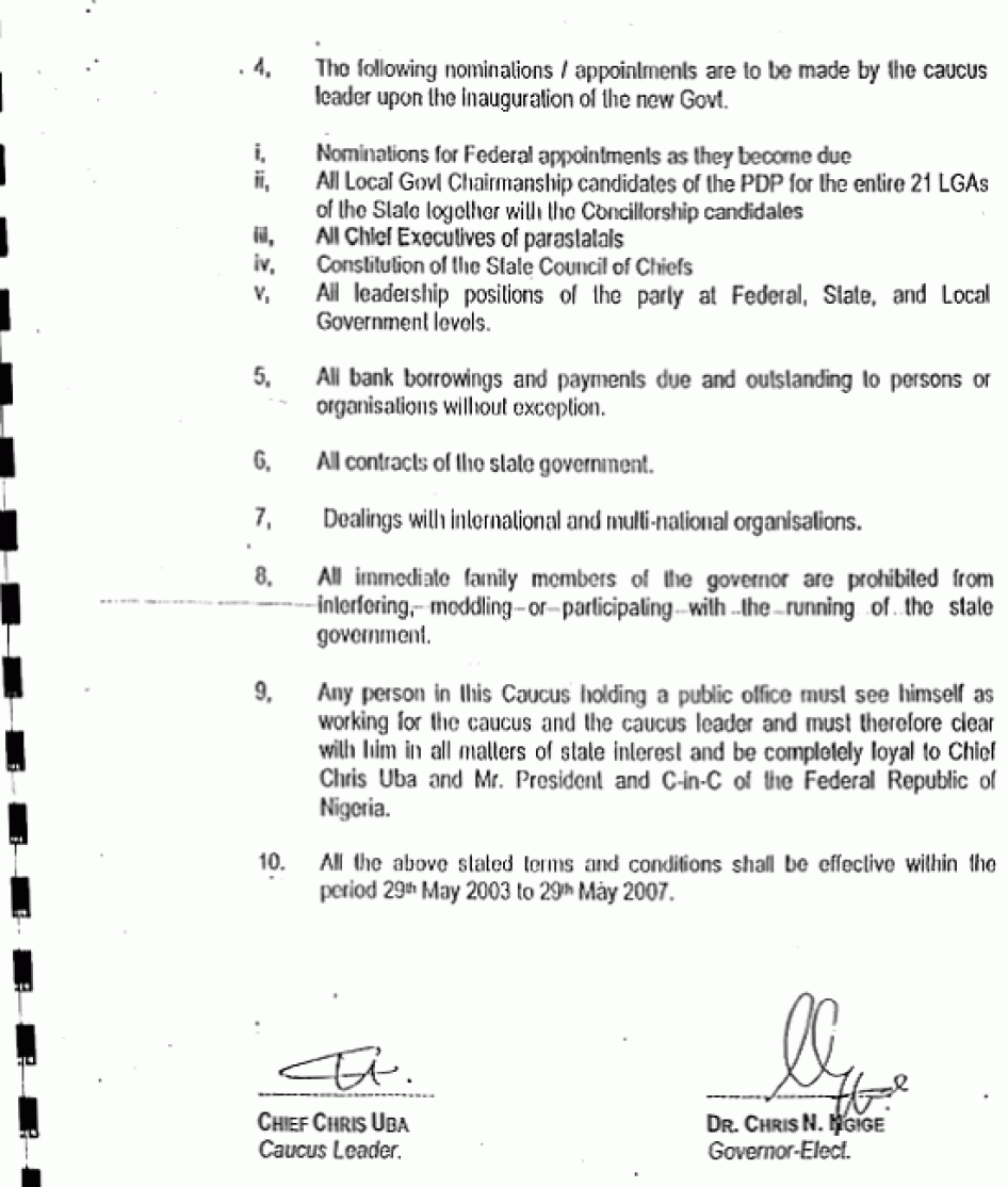 A spokesman for Anambra State Governor Peter Obi told Human Rights Watch, "If you are a member of the PDP and I belong to APGA [the All Progressives Grand Alliance opposition party] we see ourselves more or less like enemies. This is carried too far and results in thuggery, assassination and arson."[30]