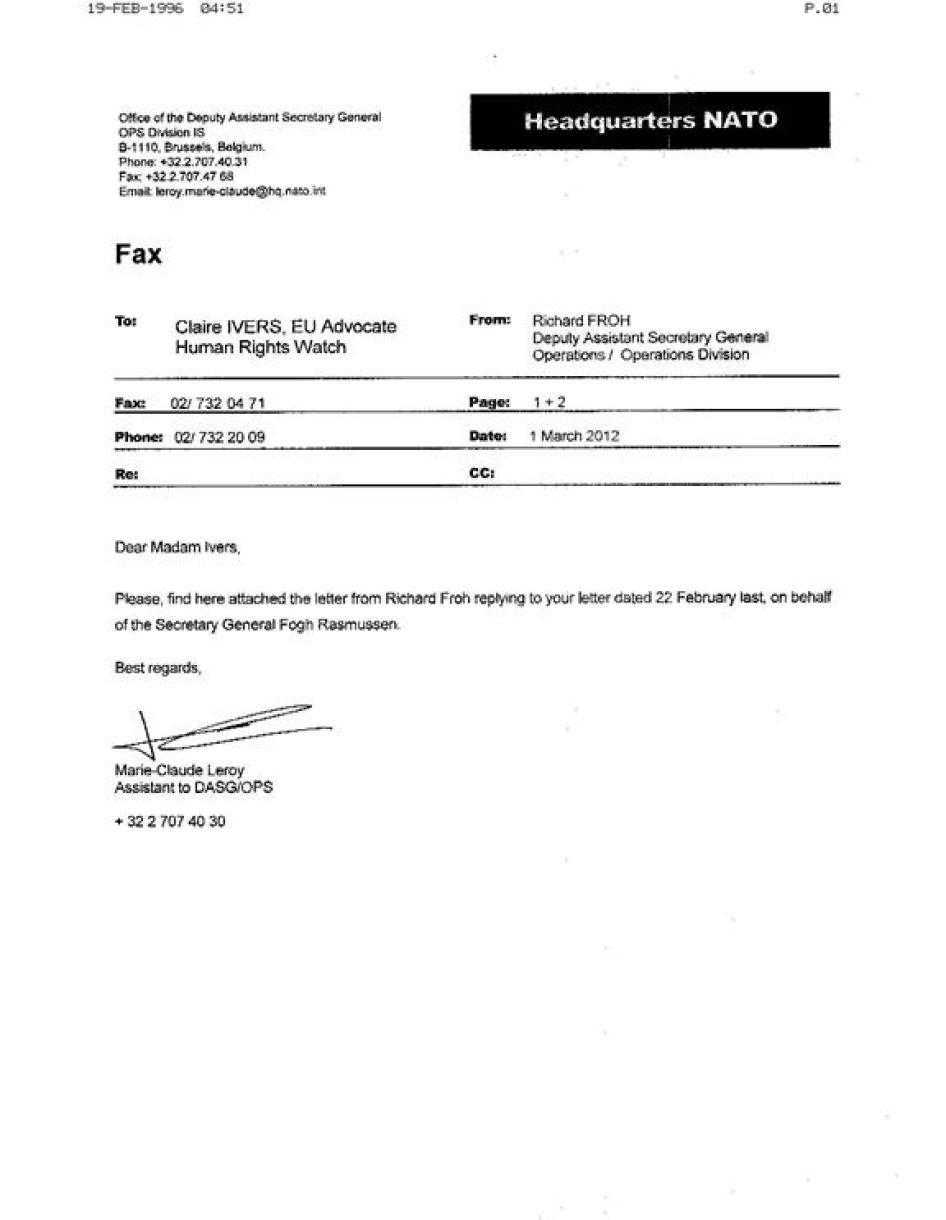 [20]Letter from Mr. Richard Froh, NATO Deputy Assistant Secretary General, to Human Rights Watch, March 1, 2012.