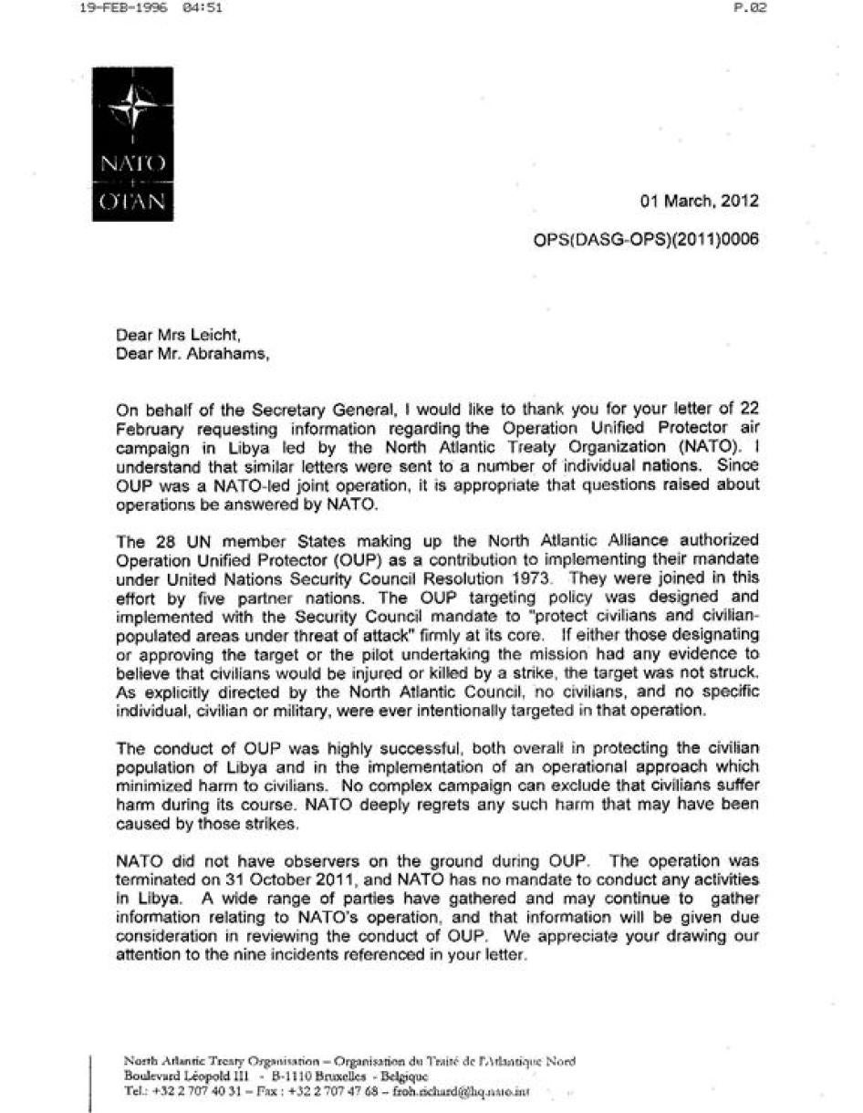 [41] Letter to Philippe Kirsch from NATO legal advisor Peter Olson, January 23, 2012, Report of the International Commission of Inquiry on Libya, Annex II.
