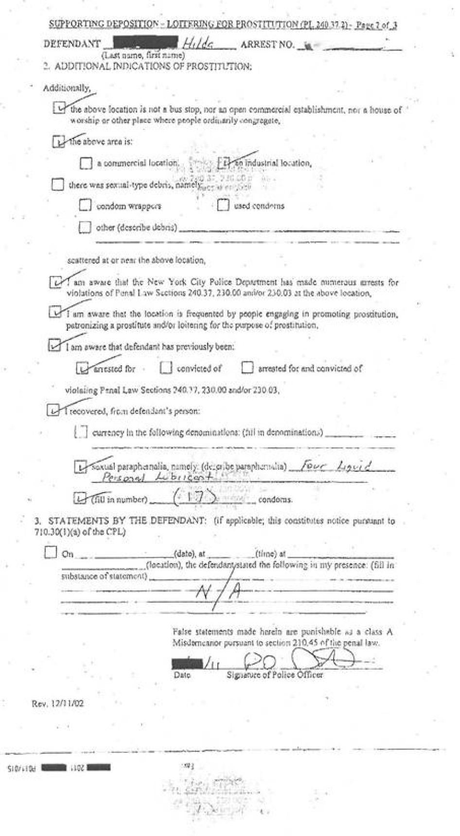 From January through November 2011 the New York City Police Department (NYPD) made 4,054 arrests for prostitution-related offenses.[31] This included 1, 899 prostitution cases (targeting the alleged provider of sex) and 1,192 arrests targeting alleged patrons of prostitutes. Six hundred and nineteen arrests were made for “loitering for the purpose of engaging in a prostitution offense.”[32]The vast majority of these arrests are disposed of without trial, primarily through plea bargaining or proceeding under a conditional discharge, usually requiring participation in a substance abuse or other “diversion” program.[33]