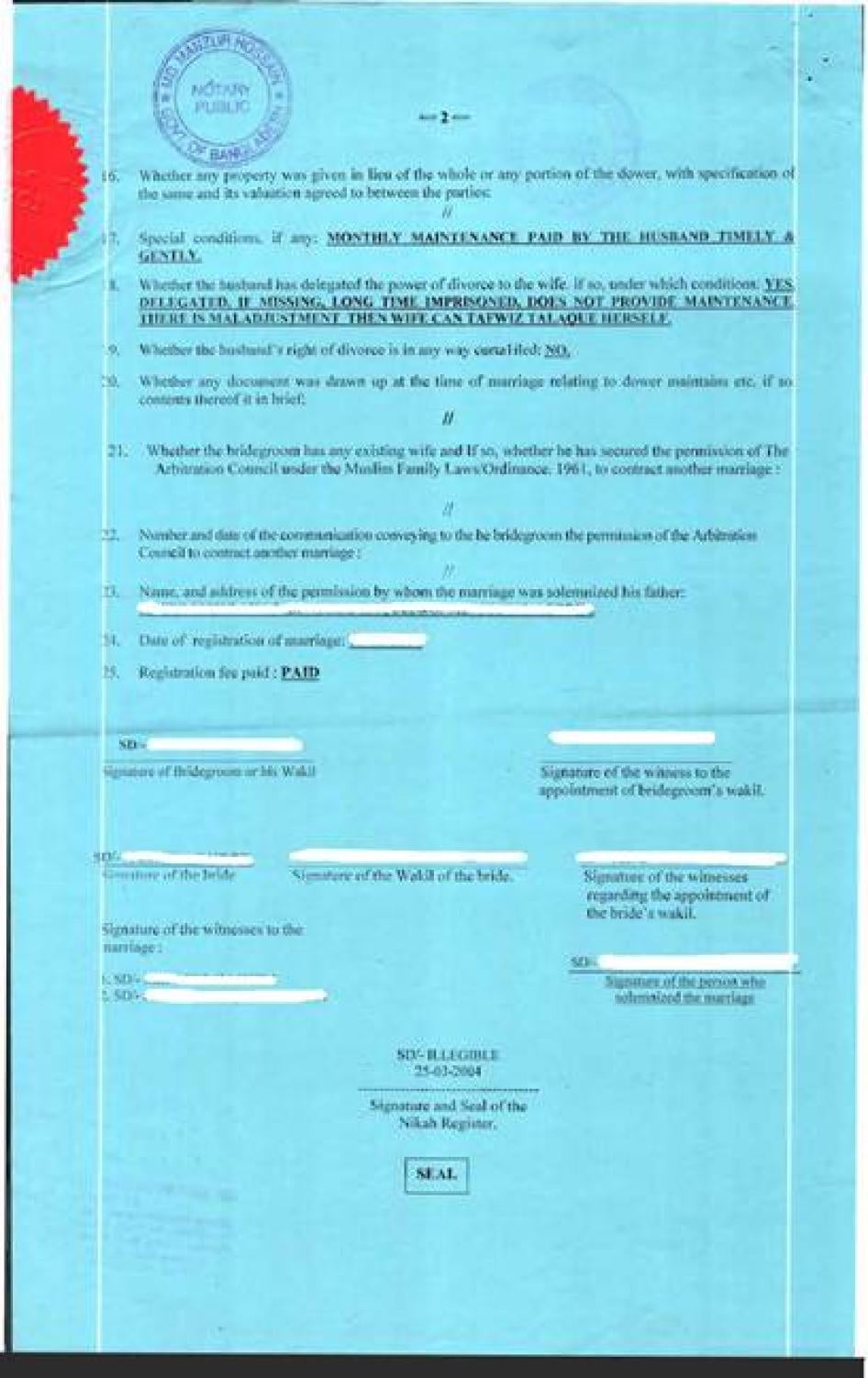 A marriage contract in Muslim law. The Bangladesh government has a standard format for such contracts. |