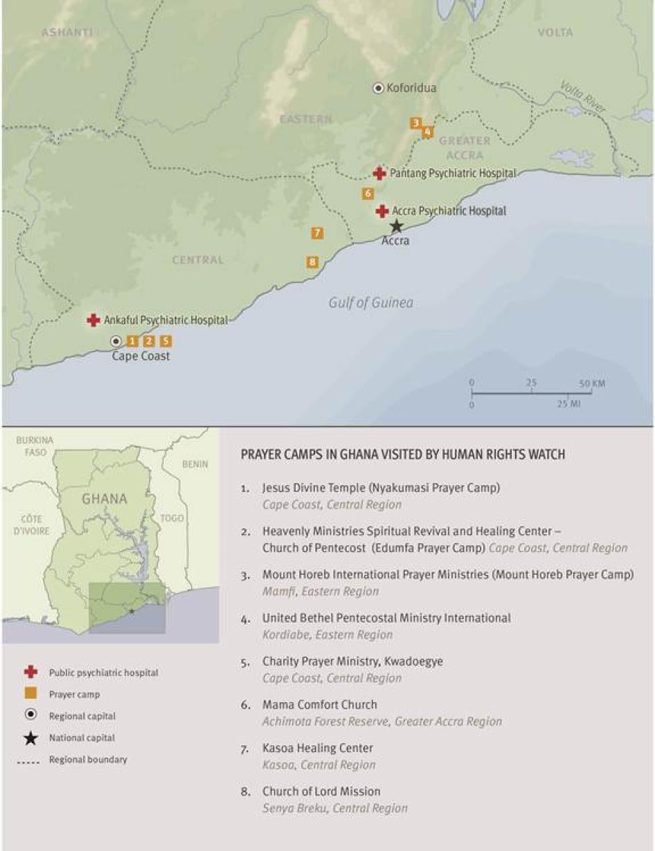 The research for this report is based on visits to eight prayer camps and three psychiatric hospitals, and interviews conducted between November 2011 and June 2012 with nearly 170 persons including persons with mental disabilities in psychiatric hospitals, prayer camps, and in the community, caregivers, government officials, health service providers, representatives of nongovernmental organizations (NGOs), including those working on disability rights and human rights more broadly, and religious leaders. Also interviewed are representatives of United Nations (UN) agencies and those of international groups working in Ghana.