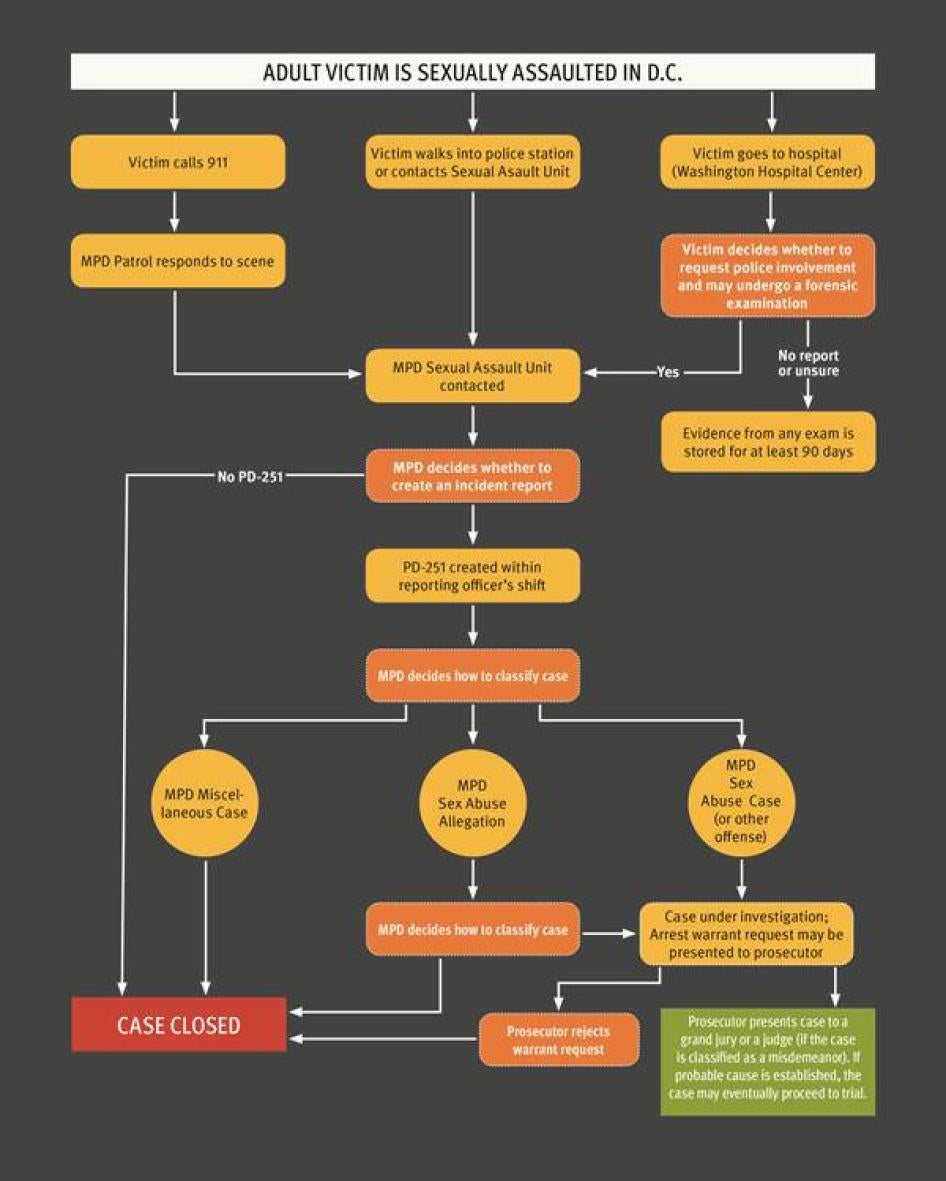 At Washington Hospital Center (WHC), where she went for the exam, Susan met a female detective from the Sexual Assault Unit (SAU) of the Metropolitan Police Department (MPD)—one of the 10 largest local police agencies in the United States and the primary law enforcement agency for the District of Columbia. The detective insisted that Susan talk to her before speaking to a rape crisis center advocate (as Susan had requested), and before having an exam. Shaking and shocked, Susan agreed.[5]