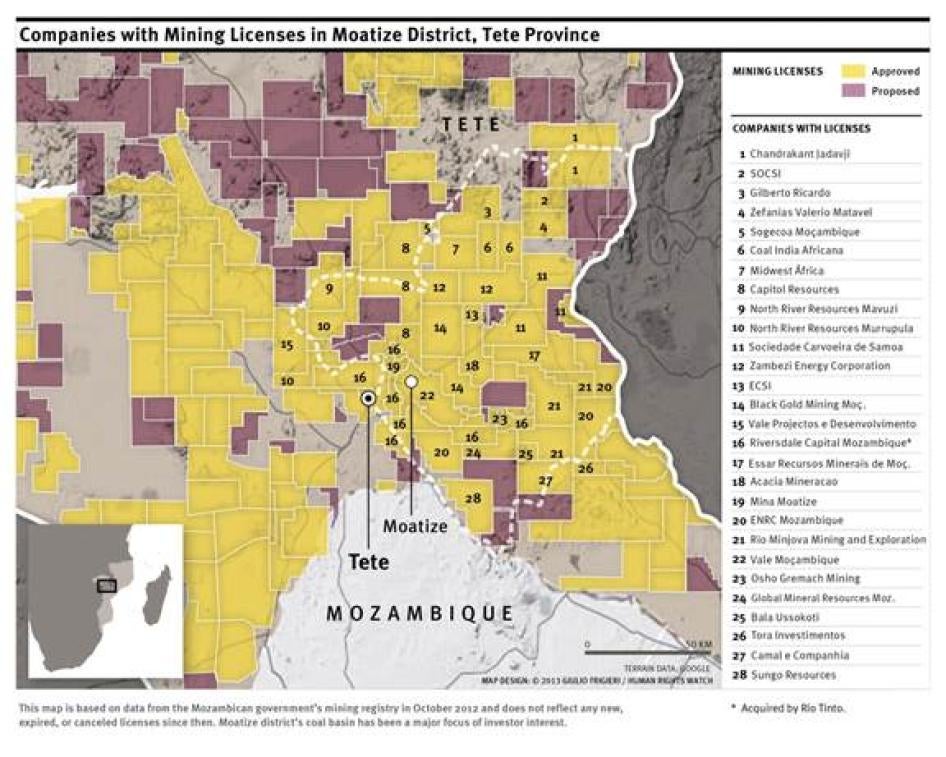 [276] Vale, “Vale in the World, Mozambique,” undated, http://www.vale.com/EN/aboutvale/across-world/Pages/default.aspx, (accessed March 29, 2013). This approximate figure for the land area of Vale’s mining licenses was calculated by Human Rights Watch using data obtained from the Government of Mozambique’s Ministry of Mineral Resources. República de Moçambique, Ministério Nacional de Minas, “Direcção Nacional de Minas, Cadastro Mineiro, Licenças por Titular,” October 9, 2012, on file with Human Rights Watch, p. 16.