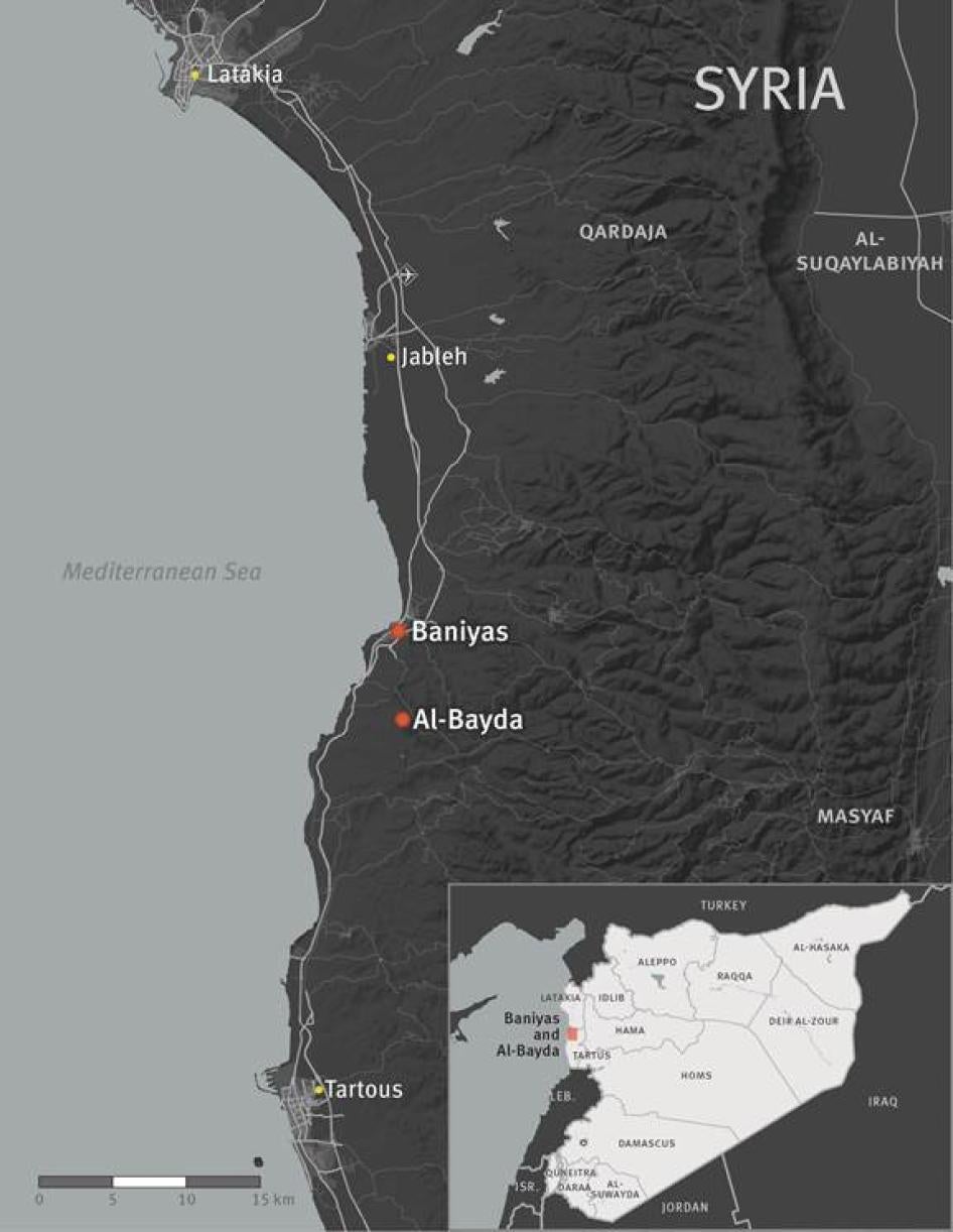 Al-Bayda is a village of approximately 7,000 residents near the coastal city of Baniyas, in Syria’s Tartous governorate. Al-Bayda’s residents are predominantly Sunni Muslims, with a small Christian minority. Together with certain neighborhoods in Baniyas, the area is considered a Sunni anti-government enclave amidst the largely Alawite and pro-government Tartous governorate.[1]
