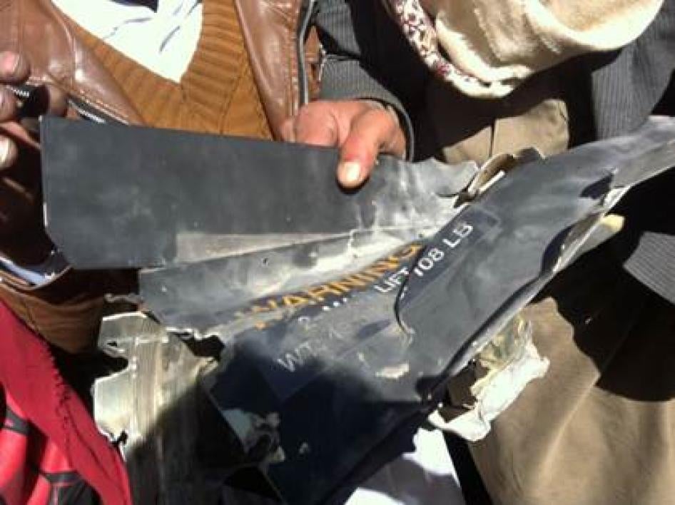 Residents show a remnant from one of the US Hellfire missiles that struck a wedding procession outside Rad`a, Yemen on December 12, 2013. © 2013 Nasser al-San`a |