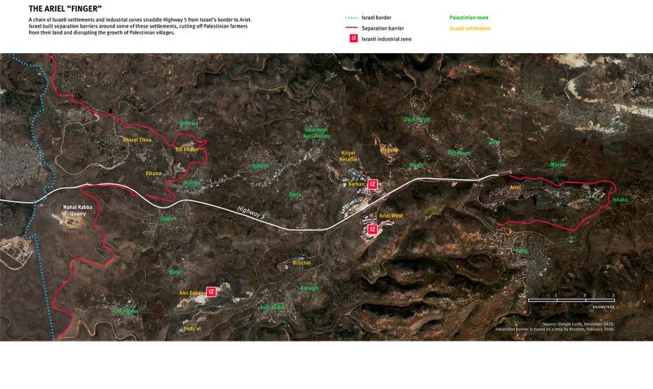 Such businesses depend on Israel’s unlawful confiscation of Palestinian land to build the settlements in the first place. Based on the findings of the report, it is Human Rights Watch's view that by facilitating settlements’ residential development, these businesses also contribute to the further confiscation of Palestinian land, restrictions on Palestinian access to their lands, and their forced displacement from these lands. The report highlights the case of Ariel, a settlement Israel first established in 1978. The 4,615 dunams (462 hectares) of land on which Ariel was initially built was seized by military order ostensibly for security purposes. In the decades since, Israel has built three security fences around the settlement, each time encompassing hundreds more dunams of privately owned Palestinian agricultural land.